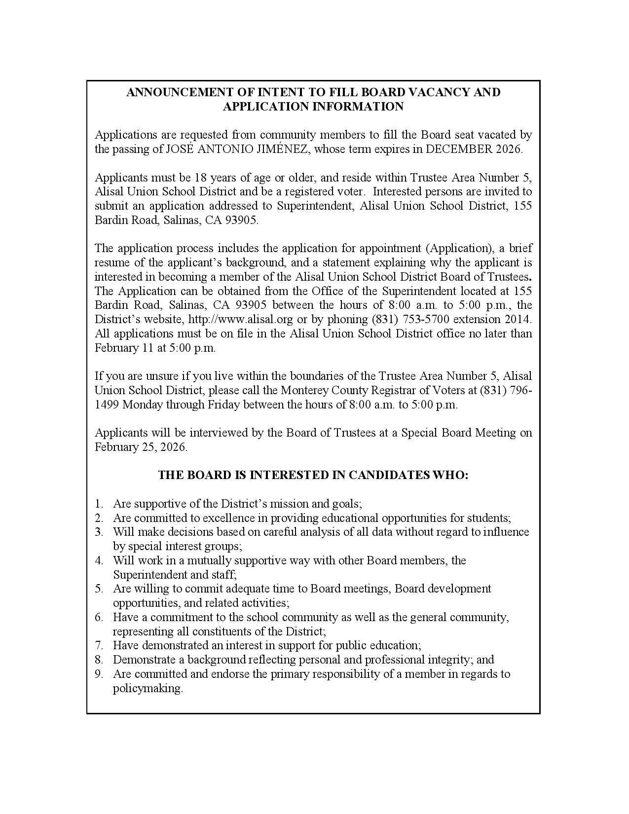 interested in becoming a member of the Alisal Union School District Board of Trustees.